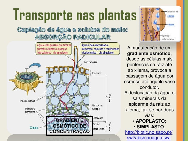 23. 23. Transporte nas plantas A manutenção de um gradiente osmótico, desde as células mais periféricas da raiz até ao xilema, provoca a passagem de água por osmose até aquele vaso condutor. A deslocação da água e sais minerais da epiderme da raiz ao xilema, faz-se por duas vias: GRADIENTE • APOPLASTO; OSMÓTICO DE • SIMPLASTO. CONCENTRAÇÂO http://biotic.no.sapo.pt/ swf/absrcaoagua.swf
