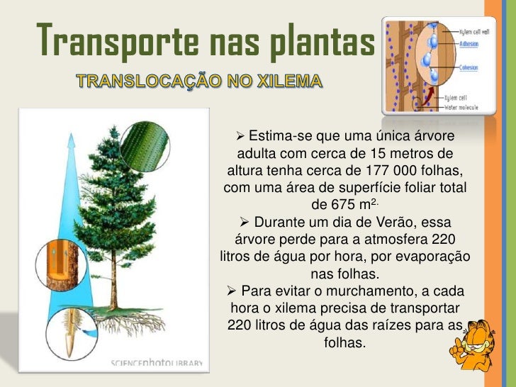 25. 25. Transporte nas plantas  Estima-se que uma única árvore adulta com cerca de 15 metros de altura tenha cerca de 177 000 folhas, com uma área de superfície foliar total de 675 m2.  Durante um dia de Verão, essa árvore perde para a atmosfera 220 litros de água por hora, por evaporação nas folhas.  Para evitar o murchamento, a cada hora o xilema precisa de transportar 220 litros de água das raízes para as folhas.