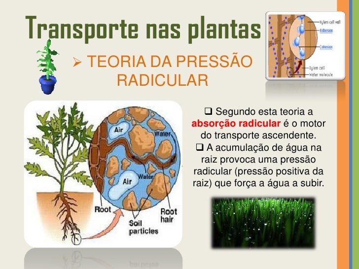 28. 28. Transporte nas plantas  TEORIA DA PRESSÃO RADICULAR  Segundo esta teoria a absorção radicular é o motor do transporte ascendente.  A acumulação de água na raiz provoca uma pressão radicular (pressão positiva da raiz) que força a água a subir.