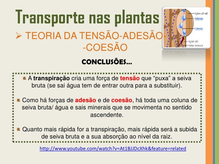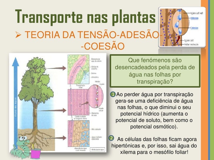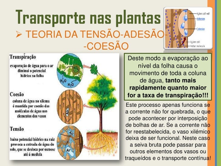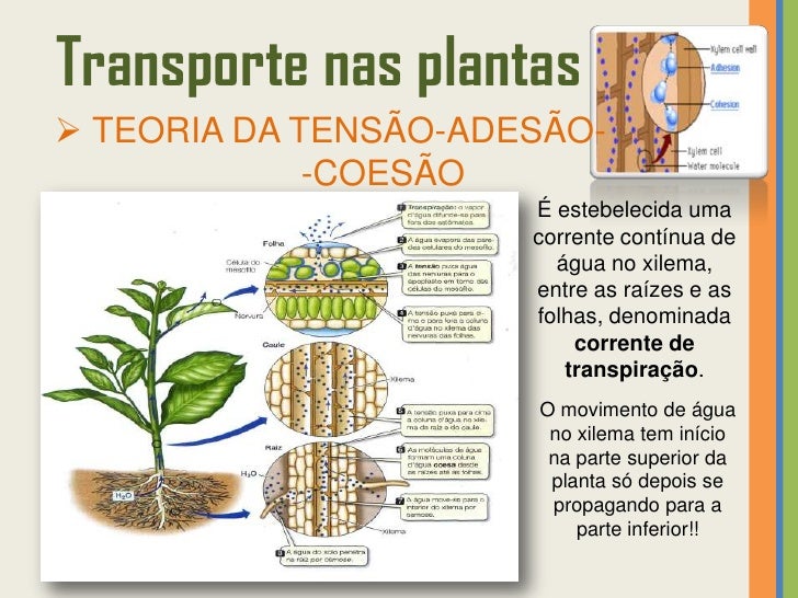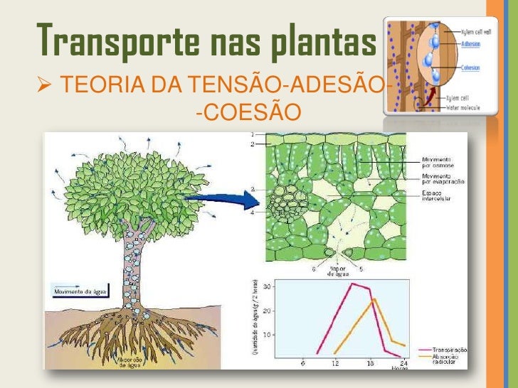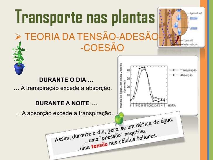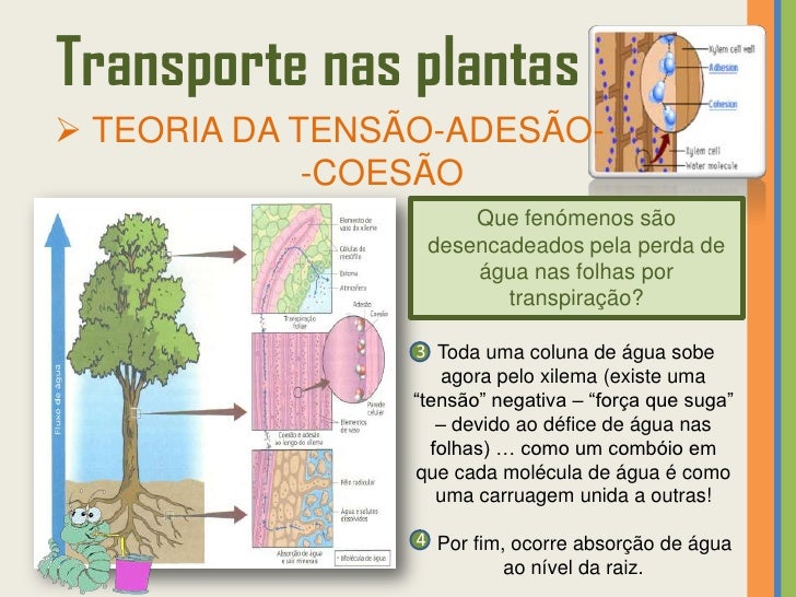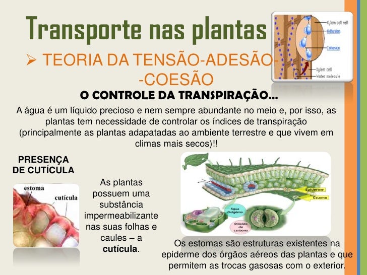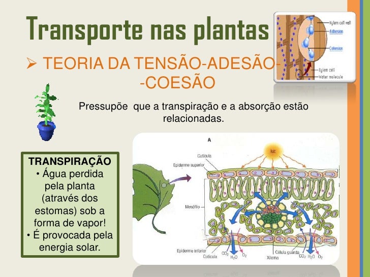 33. 33. Transporte nas plantas TEORIA DA TENSÃO-ADESÃO- -COESÃO Pressupõe que a transpiração e a absorção estão relacionadas.TRANSPIRAÇÃO • Água perdida pela planta (através dos estomas) sob a forma de vapor!• É provocada pela energia solar.