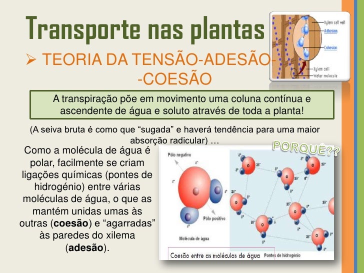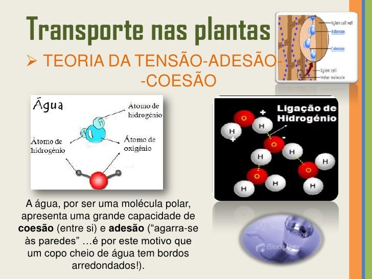 38. 38. Transporte nas plantas  TEORIA DA TENSÃO-ADESÃO- -COESÃO A água, por ser uma molécula polar, apresenta uma grande capacidade decoesão (entre si) e adesão (“agarra-se às paredes” …é por este motivo que um copo cheio de água tem bordos arredondados!).