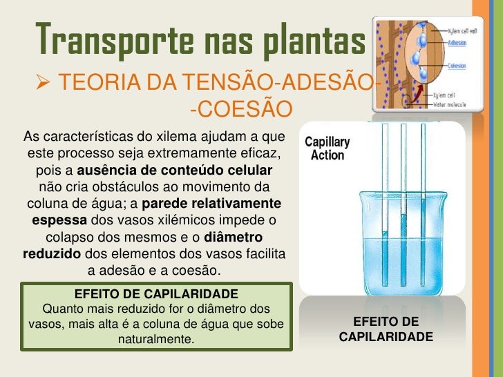 41. 41. Transporte nas plantas  TEORIA DA TENSÃO-ADESÃO- -COESÃOAs características do xilema ajudam a que este processo seja extremamente eficaz, pois a ausência de conteúdo celular não cria obstáculos ao movimento da coluna de água; a parede relativamente espessa dos vasos xilémicos impede o colapso dos mesmos e o diâmetroreduzido dos elementos dos vasos facilita a adesão e a coesão. EFEITO DE CAPILARIDADE Quanto mais reduzido for o diâmetro dosvasos, mais alta é a coluna de água que sobe EFEITO DE naturalmente. CAPILARIDADE