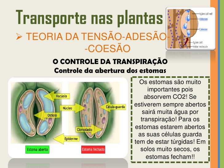 47. 47. Transporte nas plantas TEORIA DA TENSÃO-ADESÃO- -COESÃO O CONTROLE DA TRANSPIRAÇÃO Controle da abertura dos estomas Os estomas são muito importantes pois absorvem CO2! Se estiverem sempre abertos sairá muita água por transpiração! Para os estomas estarem abertos as suas células guarda tem de estar túrgidas! Em solos muito secos, os estomas fecham!!
