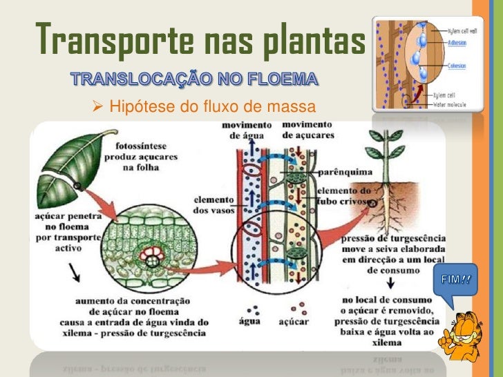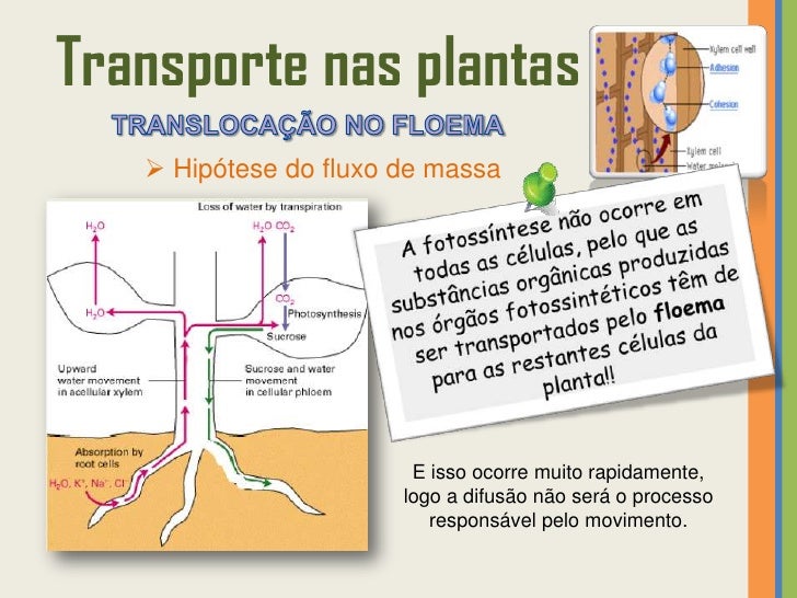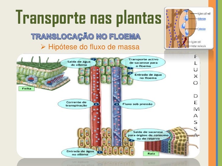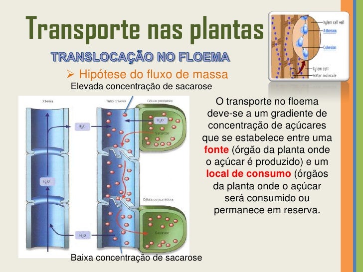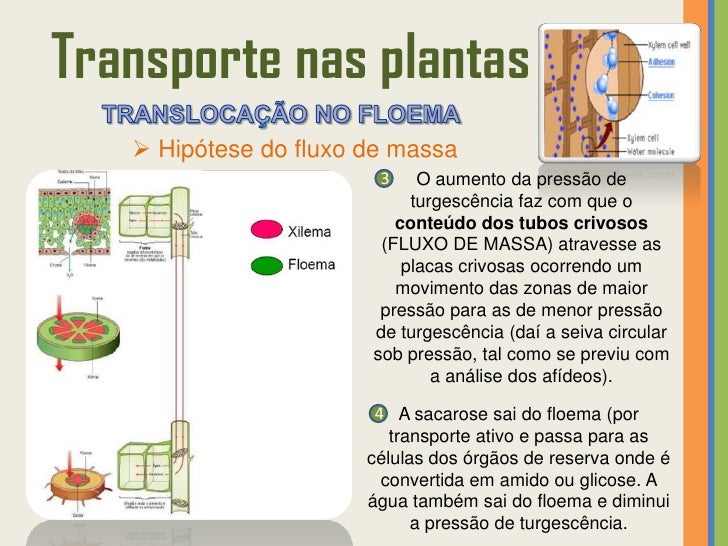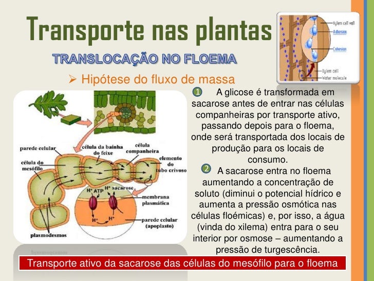 57. 57. Transporte nas plantas  Hipótese do fluxo de massa 1 A glicose é transformada em sacarose antes de entrar nas células companheiras por transporte ativo, passando depois para o floema, onde será transportada dos locais de produção para os locais de consumo. 2 A sacarose entra no floema aumentando a concentração de soluto (diminui o potencial hídrico e aumenta a pressão osmótica nas células floémicas) e, por isso, a água (vinda do xilema) entra para o seu interior por osmose – aumentando a pressão de turgescência.Transporte ativo da sacarose das células do mesófilo para o floema