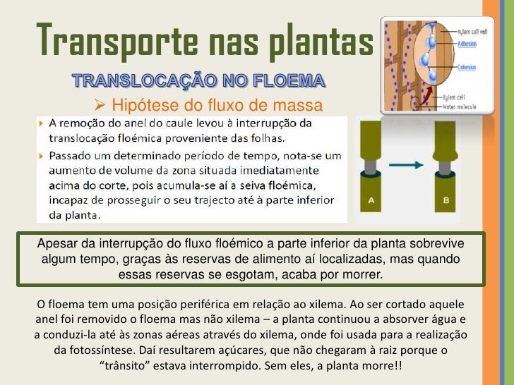 52. 52. Transporte nas plantas  Hipótese do fluxo de massa É difícil estudar o mecanismo de transporte da seiva eleborada pois esta circula em células vivas do floema e qualquer introdução mecânica ou artificial perturba aquelas células.
