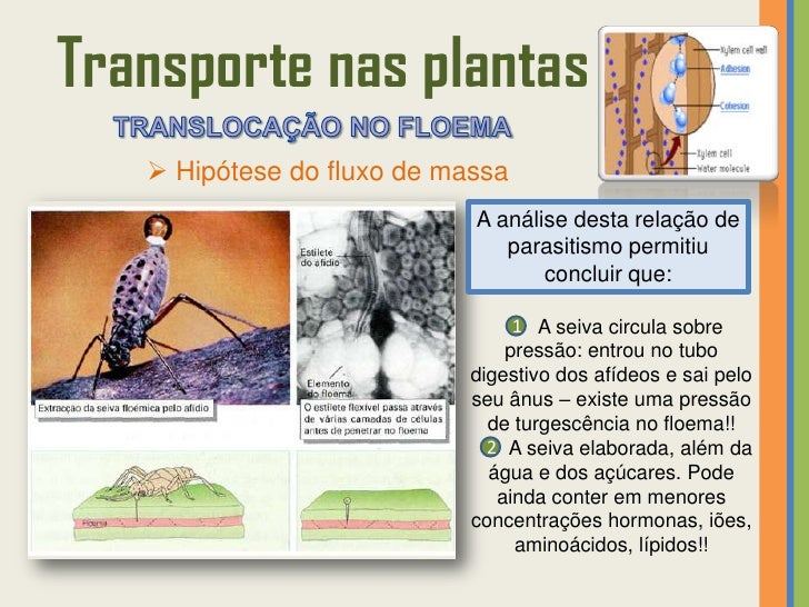 53. 53. Transporte nas plantas  Hipótese do fluxo de massa A análise desta relação de parasitismo permitiu concluir que: 1 A seiva circula sobre pressão: entrou no tubo digestivo dos afídeos e sai pelo seu ânus – existe uma pressão de turgescência no floema!! 2 A seiva elaborada, além da água e dos açúcares. Pode ainda conter em menores concentrações hormonas, iões, aminoácidos, lípidos!!