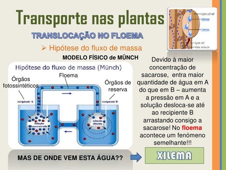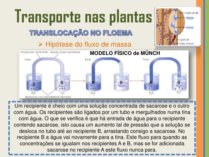 54. 54. Transporte nas plantas  Hipótese do fluxo de massa MODELO FÍSICO de MÜNCH A B A B A BUm recipiente é cheio com uma solução concentrada de sacarose e o outrocom água. Os recipientes são ligados por um tubo e mergulhados numa tina com água. O que se verifica é que há entrada de água para o recipientecontendo sacarose, isto causa um aumento tal de pressão que a solução se desloca no tubo até ao recipiente B, arrastando consigo a sacarose. No recipiente B a água vai novamente para a tina. Este fluxo para quando as concentrações se igualam nos recipientes A e B, mas se for adicionada sacarose no recipiente A este fluxo nunca para.