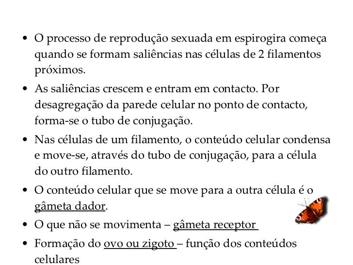 <ul><li>O processo de reprodução sexuada em espirogira começa quando se formam saliências nas células de 2 filamentos próx...