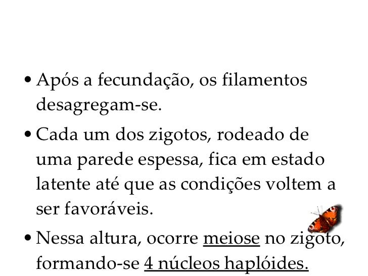 11. 11. <ul><li>Após a fecundação, os filamentos desagregam-se. </li></ul><ul><li>Cada um dos zigotos, rodeado de uma parede espessa, fica em estado latente até que as condições voltem a ser favoráveis. </li></ul><ul><li>Nessa altura, ocorre meiose no zigoto, formando-se 4 núcleos haplóides. </li></ul>