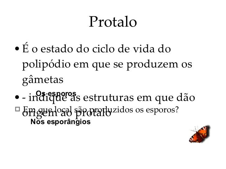 24. 24. Protalo <ul><li>É o estado do ciclo de vida do polipódio em que se produzem os gâmetas </li></ul><ul><li>- indique as estruturas em que dão origem ao protalo </li></ul>Os esporos <ul><li>Em que local são produzidos os esporos? </li></ul>Nos esporângios