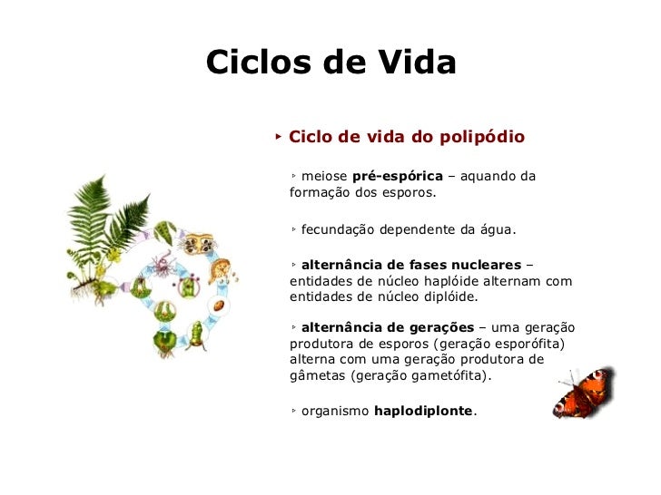 Ciclos de Vida ►   Ciclo de vida do polipódio ▹  meiose  pré-espórica  – aquando da formação dos esporos. ▹  fecundação de...