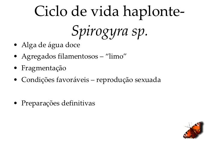 Ciclo de vida haplonte-  Spirogyra sp. <ul><li>Alga de água doce </li></ul><ul><li>Agregados filamentosos – “limo” </li></...
