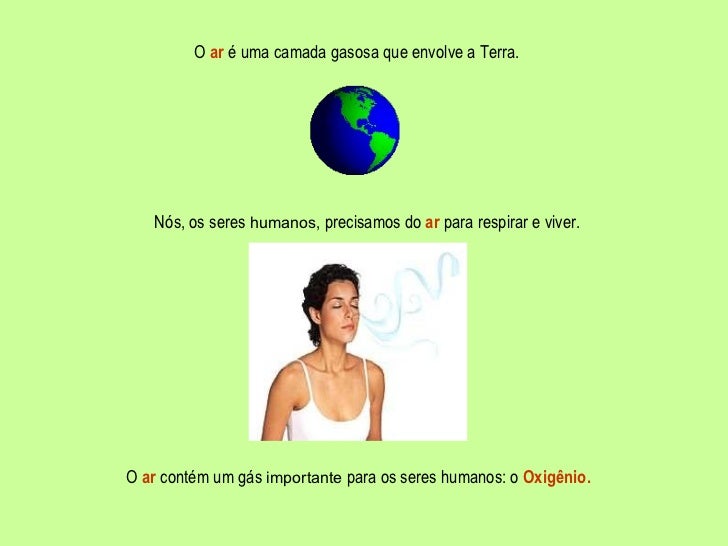 O  ar  é uma camada gasosa que envolve a Terra. Nós, os seres  humanos , precisamos do  ar  para respirar e viver. O  ar  ...