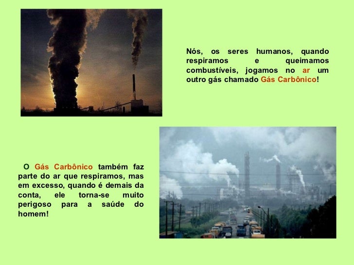 Nós, os seres humanos, quando respiramos e queimamos combustíveis, jogamos no  ar  um outro gás chamado  Gás Carbônico ! O...