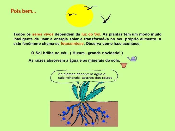 14. 14. Pois bem... Todos os seres vivos dependem da luz do Sol . As plantas têm um modo muito inteligente de usar a energia solar e transformá-la no seu próprio alimento. A este fenômeno chama-se fotossíntese . Observa como isso acontece. O Sol brilha no céu. ( Humm...grande novidade! ) As raízes absorvem a água e os minerais do solo.
