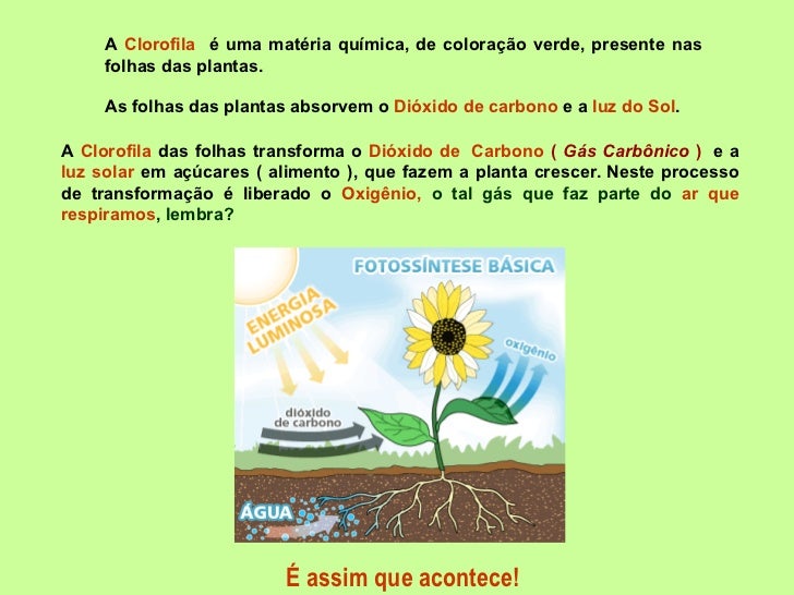 As folhas das plantas absorvem o  Dióxido de carbono  e a  luz do Sol .   A  Clorofila  é uma matéria química, de coloraçã...