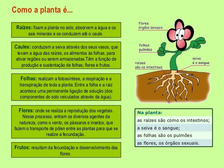 17. 17. Como a planta é... Raízes: fixam a planta no solo, absorvem a água e os sais minerais e os conduzem até o caule. Caules: conduzem a seiva através dos seus vasos, que levam a água das raízes, os alimentos às folhas, para ativar regiões ou serem armazenadas.Têm a função de produção e sustentação de folhas, flores e frutos. Folhas: realizam a fotossíntese, a respiração e a transpiração de toda a planta. Entre a folha e a raiz acontece uma permanente ligação de solução (dos componentes do solo veiculados através da água). Flores: onde se realiza a reprodução dos vegetais. Nesse processo, entram os diversos agentes da natureza, como o vento, os pássaros e insetos, que fazem o transporte de pólen entre as plantas para que se realize a fecundação. Frutos: resultam da fecundação e desenvolvimento das flores. Na planta: as raízes são como os intestinos; a seiva é o sangue; as folhas são os pulmões as flores, os órgãos sexuais.