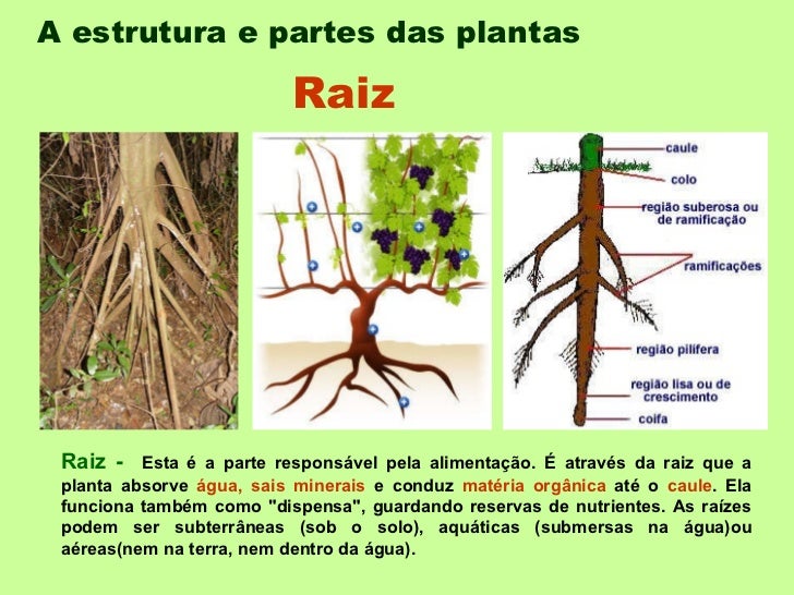 2. 2. A estrutura e partes das plantas Raiz - Esta é a parte responsável pela alimentação. É através da raiz que a planta absorve água, sais minerais e conduz matéria orgânica até o caule . Ela funciona também como "dispensa", guardando reservas de nutrientes. As raízes podem ser subterrâneas (sob o solo), aquáticas (submersas na água)ou aéreas(nem na terra, nem dentro da água). Raiz