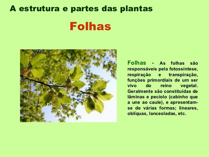 A estrutura e partes das plantas   Folhas -  As folhas são responsáveis pela fotossíntese, respiração e transpiração, funç...