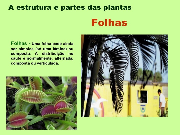 A estrutura e partes das plantas   Folhas -  Uma folha pode ainda ser simples (só uma lâmina) ou composta. A distribuição ...
