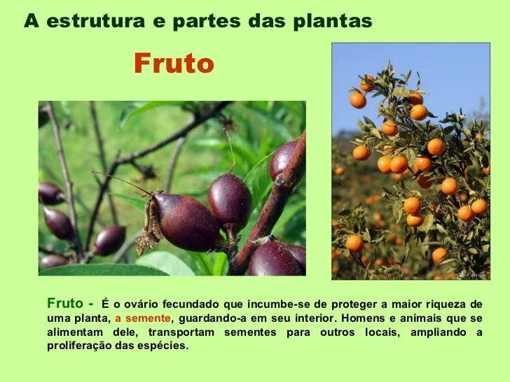A estrutura e partes das plantas   Fruto -  É o ovário fecundado que incumbe-se de proteger a maior riqueza de uma planta,...