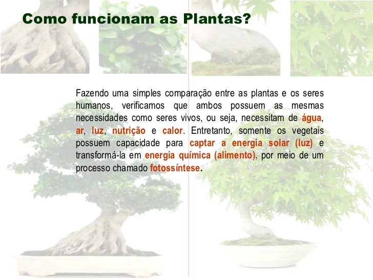 9. 9. Fazendo uma simples comparação entre as plantas e os seres humanos, verificamos que ambos possuem as mesmas necessidades como seres vivos, ou seja, necessitam de água , ar , luz , nutrição e calor . Entretanto, somente os vegetais possuem capacidade para captar a energia solar (luz) e transformá-la em energia química (alimento), por meio de um processo chamado fotossíntese . Como funcionam as Plantas?