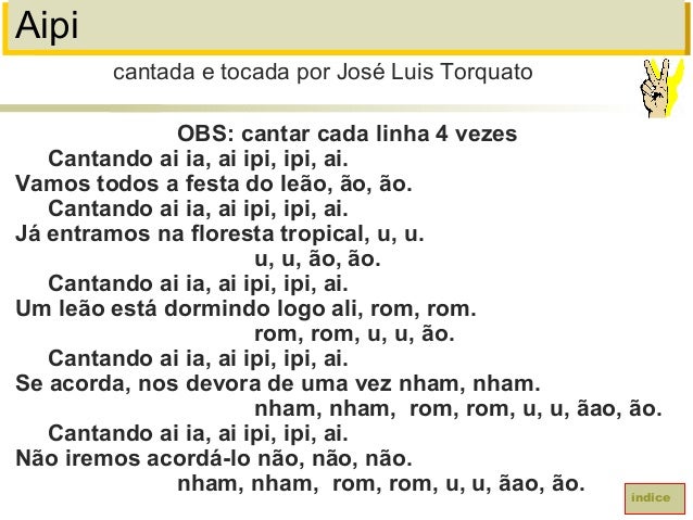 10. 10. AipiOBS: cantar cada linha 4 vezesCantando ai ia, ai ipi, ipi, ai.Vamos todos a festa do leão, ão, ão.Cantando ai ia, ai ipi, ipi, ai.Já entramos na floresta tropical, u, u.u, u, ão, ão.Cantando ai ia, ai ipi, ipi, ai.Um leão está dormindo logo ali, rom, rom.rom, rom, u, u, ão.Cantando ai ia, ai ipi, ipi, ai.Se acorda, nos devora de uma vez nham, nham.nham, nham, rom, rom, u, u, ãao, ão.Cantando ai ia, ai ipi, ipi, ai.Não iremos acordá-lo não, não, não.nham, nham, rom, rom, u, u, ãao, ão.cantada e tocada por José Luis Torquatoíndice