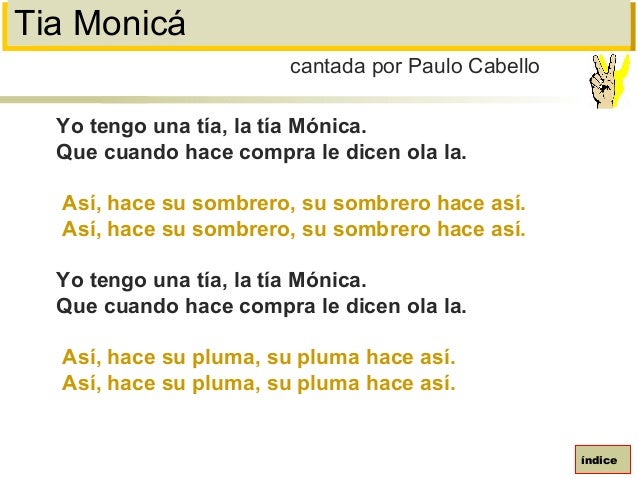 100. 100. Tia MonicáYo tengo una tía, la tía Mónica.Que cuando hace compra le dicen ola la.Así, hace su sombrero, su sombrero hace así.Así, hace su sombrero, su sombrero hace así.Yo tengo una tía, la tía Mónica.Que cuando hace compra le dicen ola la.Así, hace su pluma, su pluma hace así.Así, hace su pluma, su pluma hace así.cantada por Paulo Cabelloíndice