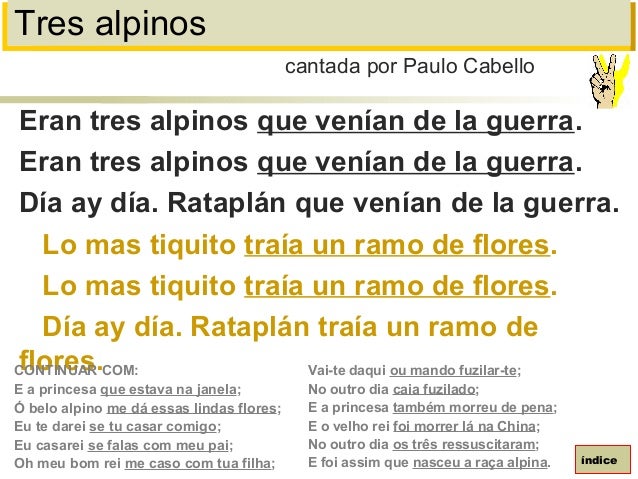 101. 101. Tres alpinosEran tres alpinos que venían de la guerra.Eran tres alpinos que venían de la guerra.Día ay día. Rataplán que venían de la guerra.Lo mas tiquito traía un ramo de flores.Lo mas tiquito traía un ramo de flores.Día ay día. Rataplán traía un ramo deflores.cantada por Paulo CabelloíndiceCONTINUAR COM:E a princesa que estava na janela;Ó belo alpino me dá essas lindas flores;Eu te darei se tu casar comigo;Eu casarei se falas com meu pai;Oh meu bom rei me caso com tua filha;Vai-te daqui ou mando fuzilar-te;No outro dia caia fuzilado;E a princesa também morreu de pena;E o velho rei foi morrer lá na China;No outro dia os três ressuscitaram;E foi assim que nasceu a raça alpina.