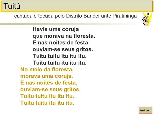 102. 102. TuitúHavia uma corujaque morava na floresta.E nas noites de festa,ouviam-se seus gritos.Tuitu tuitu itu itu itu.Tuitu tuitu itu itu itu.No meio da floresta,morava uma coruja.E nas noites de festa,ouviam-se seus gritos.Tuitu tuitu itu itu itu.Tuitu tuitu itu itu itu.cantada e tocada pelo Distrito Bandeirante Piratiningaíndice