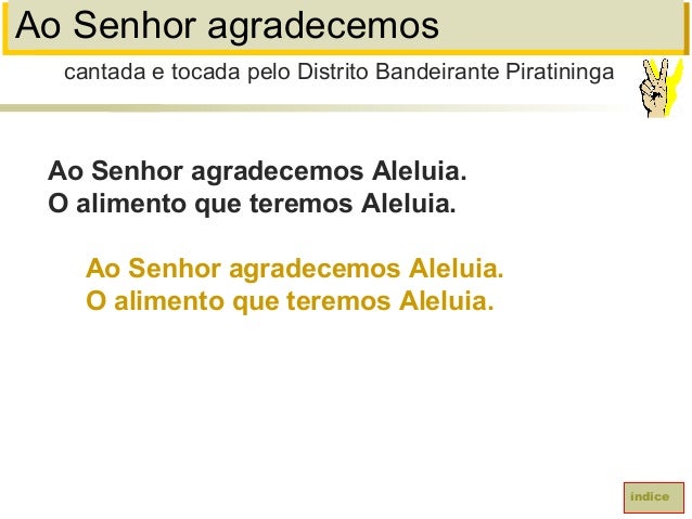 13. 13. Ao Senhor agradecemosAo Senhor agradecemos Aleluia.O alimento que teremos Aleluia.Ao Senhor agradecemos Aleluia.O alimento que teremos Aleluia.índicecantada e tocada pelo Distrito Bandeirante Piratininga