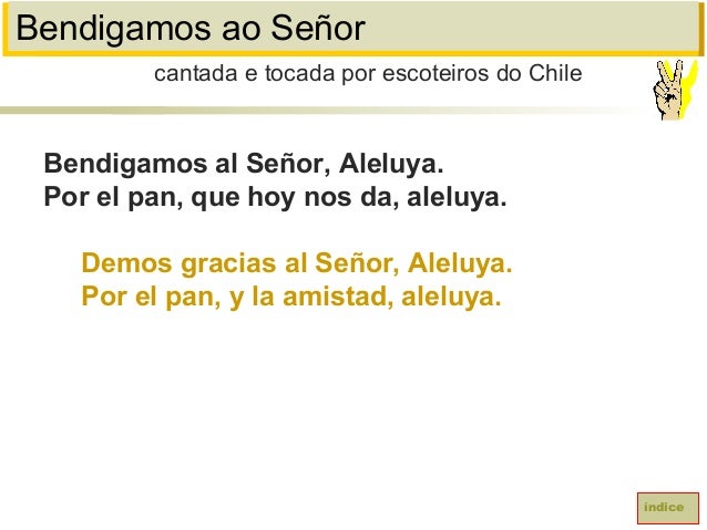 16. 16. Bendigamos ao SeñorBendigamos al Señor, Aleluya.Por el pan, que hoy nos da, aleluya.Demos gracias al Señor, Aleluya.Por el pan, y la amistad, aleluya.cantada e tocada por escoteiros do Chileíndice