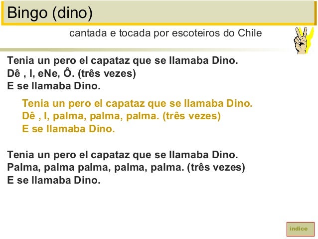17. 17. Bingo (dino)Tenia un pero el capataz que se llamaba Dino.Dê , I, eNe, Ô. (três vezes)E se llamaba Dino.Tenia un pero el capataz que se llamaba Dino.Dê , I, palma, palma, palma. (três vezes)E se llamaba Dino.Tenia un pero el capataz que se llamaba Dino.Palma, palma palma, palma, palma. (três vezes)E se llamaba Dino.cantada e tocada por escoteiros do Chileíndice