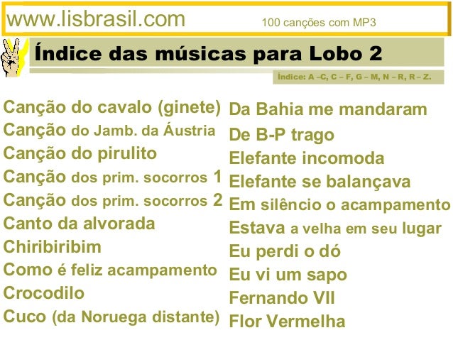 2. 2. Índice das músicas para Lobo 2www.lisbrasil.com 100 canções com MP3Da Bahia me mandaramDe B-P tragoElefante incomodaElefante se balançavaEm silêncio o acampamentoEstava a velha em seu lugarEu perdi o dóEu vi um sapoFernando VIIFlor VermelhaCanção do cavalo (ginete)Canção do Jamb. da ÁustriaCanção do pirulitoCanção dos prim. socorros 1Canção dos prim. socorros 2Canto da alvoradaChiribiribimComo é feliz acampamentoCrocodiloCuco (da Noruega distante)Índice: A –C, C – F, G – M, N – R, R – Z.