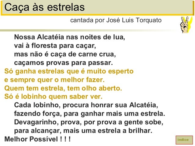 20. 20. Caça às estrelasNossa Alcatéia nas noites de lua,vai à floresta para caçar,mas não é caça de carne crua,caçamos provas para passar.Só ganha estrelas que é muito espertoe sempre quer o melhor fazer.Quem tem estrela, tem olho aberto.Só é lobinho quem saber ver.Cada lobinho, procura honrar sua Alcatéia,fazendo força, para ganhar mais uma estrela.Devagarinho, prova, por prova a gente sobe,para alcançar, mais uma estrela a brilhar.Melhor Possível ! ! !cantada por José Luis Torquatoíndice