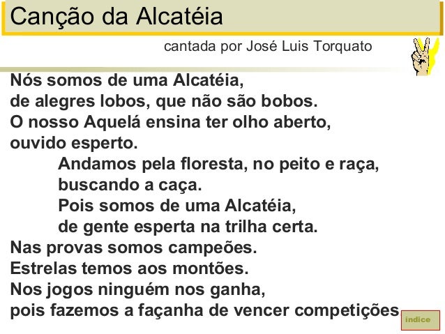 21. 21. Canção da AlcatéiaNós somos de uma Alcatéia,de alegres lobos, que não são bobos.O nosso Aquelá ensina ter olho aberto,ouvido esperto.Andamos pela floresta, no peito e raça,buscando a caça.Pois somos de uma Alcatéia,de gente esperta na trilha certa.Nas provas somos campeões.Estrelas temos aos montões.Nos jogos ninguém nos ganha,pois fazemos a façanha de vencer competições.cantada por José Luis Torquatoíndice
