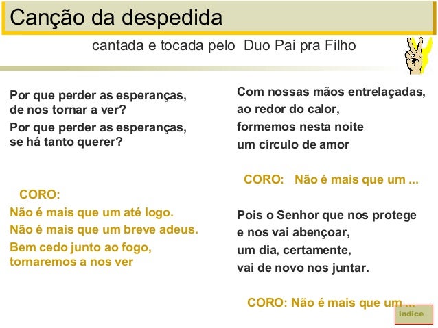 22. 22. Canção da despedidaPor que perder as esperanças,de nos tornar a ver?Por que perder as esperanças,se há tanto querer?CORO:Não é mais que um até logo.Não é mais que um breve adeus.Bem cedo junto ao fogo,tornaremos a nos vercantada e tocada pelo Duo Pai pra FilhoíndiceCom nossas mãos entrelaçadas,ao redor do calor,formemos nesta noiteum círculo de amorCORO: Não é mais que um ...Pois o Senhor que nos protegee nos vai abençoar,um dia, certamente,vai de novo nos juntar.CORO: Não é mais que um ...