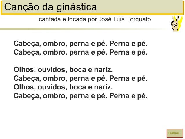 23. 23. Canção da ginásticaCabeça, ombro, perna e pé. Perna e pé.Cabeça, ombro, perna e pé. Perna e pé.Olhos, ouvidos, boca e nariz.Cabeça, ombro, perna e pé. Perna e pé.Olhos, ouvidos, boca e nariz.Cabeça, ombro, perna e pé. Perna e pé.cantada e tocada por José Luis Torquatoíndice