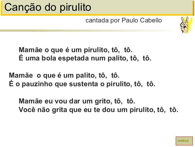 27. 27. Canção do pirulitoMamãe o que é um pirulito, tô, tô.É uma bola espetada num palito, tô, tô.Mamãe o que é um palito, tô, tô.É o pauzinho que sustenta o pirulito, tô, tô.Mamãe eu vou dar um grito, tô, tô.Você não grita que eu te dou um pirulito, tô, tô.cantada por Paulo Cabelloíndice