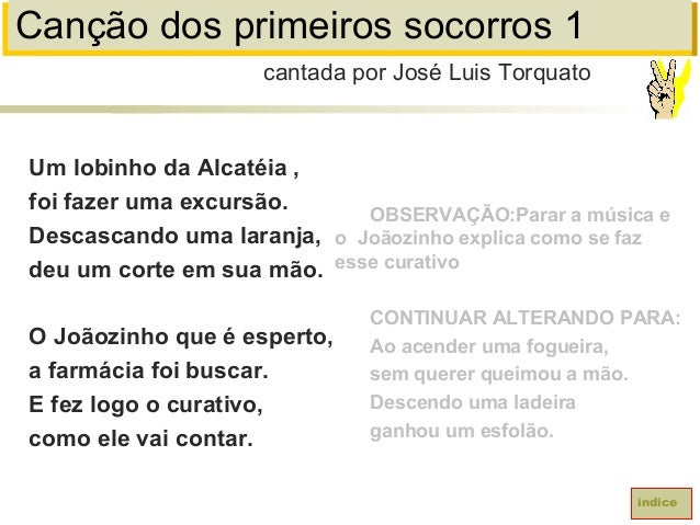 28. 28. Canção dos primeiros socorros 1Um lobinho da Alcatéia ,foi fazer uma excursão.Descascando uma laranja,deu um corte em sua mão.O Joãozinho que é esperto,a farmácia foi buscar.E fez logo o curativo,como ele vai contar.cantada por José Luis TorquatoíndiceOBSERVAÇÃO:Parar a música eo Joãozinho explica como se fazesse curativoCONTINUAR ALTERANDO PARA:Ao acender uma fogueira,sem querer queimou a mão.Descendo uma ladeiraganhou um esfolão.