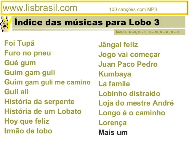 3. 3. Índice das músicas para Lobo 3www.lisbrasil.com 100 canções com MP3Jângal felizJogo vai começarJuan Paco PedroKumbayaLa famileLobinho distraídoLoja do mestre AndréLongo é o caminhoLorençaMais umFoi TupãFuro no pneuGué gumGuim gam guliGuim gam guli me caminoGuli aliHistória da serpenteHistória de um LobatoHoy que felizIrmão de loboÍndice: A –C, C – F, G – M, N – R, R – Z.