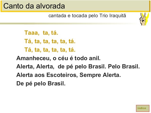 30. 30. Canto da alvoradaTaaa, ta, tá.Tá, ta, ta, ta, ta, tá.Tá, ta, ta, ta, ta, tá.Amanheceu, o céu é todo anil.Alerta, Alerta, de pé pelo Brasil. Pelo Brasil.Alerta aos Escoteiros, Sempre Alerta.De pé pelo Brasil.cantada e tocada pelo Trio Iraquitãíndice