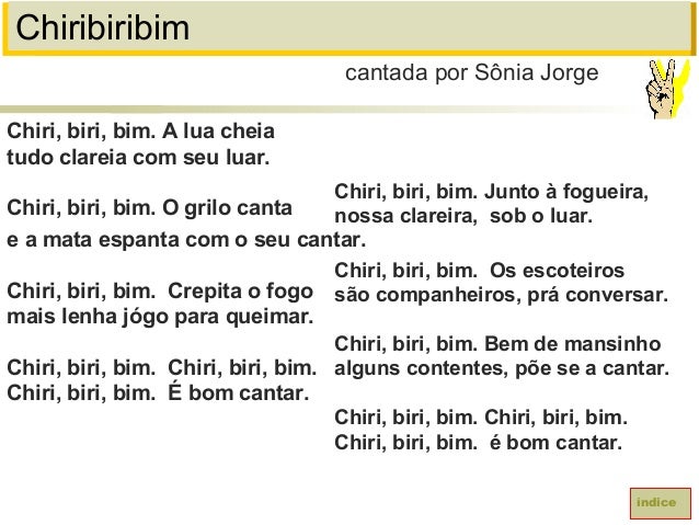 31. 31. ChiribiribimChiri, biri, bim. A lua cheiatudo clareia com seu luar.Chiri, biri, bim. O grilo cantae a mata espanta com o seu cantar.Chiri, biri, bim. Crepita o fogomais lenha jógo para queimar.Chiri, biri, bim. Chiri, biri, bim.Chiri, biri, bim. É bom cantar.cantada por Sônia JorgeíndiceChiri, biri, bim. Junto à fogueira,nossa clareira, sob o luar.Chiri, biri, bim. Os escoteirossão companheiros, prá conversar.Chiri, biri, bim. Bem de mansinhoalguns contentes, põe se a cantar.Chiri, biri, bim. Chiri, biri, bim.Chiri, biri, bim. é bom cantar.