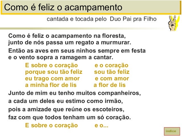 33. 33. Como é feliz o acampamentoComo é feliz o acampamento na floresta,junto de nós passa um regato a murmurar.Então as aves em seus ninhos sempre em festae o vento sopra a ramagem a cantar.E sobre o coração e o coraçãoporque sou tão feliz sou tão felizeu trago com amor e com amora minha flor de lis a flor de lisJunto de mim eu tenho muitos companheiros,a cada um deles eu estimo como irmão,pois a amizade que reúne os escoteiros,faz com que todos tenham um só coração.E sobre o coração e o...cantada e tocada pelo Duo Pai pra Filhoíndice