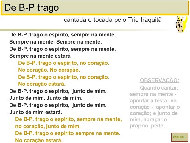 36. 36. De B-P tragoDe B-P. trago o espírito, sempre na mente.Sempre na mente. Sempre na mente.De B-P. trago o espírito, sempre na mente.Sempre na mente estará.De B-P. trago o espírito, no coração.No coração. No coração.De B-P. trago o espírito, no coração.No coração estará.De B-P. trago o espírito, junto de mim.Junto de mim. Junto de mim.De B-P. trago o espírito, junto de mim.Junto de mim estará.De B-P. trago o espírito, sempre na mente,no coração, junto de mim.De B-P. trago o espírito sempre na mente.No coração estará.cantada e tocada pelo Trio IraquitãíndiceOBSERVAÇÃO:Quando cantar:sempre na mente -apontar a testa; nocoração - apontar ocoração; e junto demim, abraçar opróprio peito.