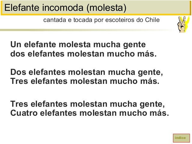 37. 37. Elefante incomoda (molesta)Un elefante molesta mucha gentedos elefantes molestan mucho más.Dos elefantes molestan mucha gente,Tres elefantes molestan mucho más.Tres elefantes molestan mucha gente,Cuatro elefantes molestan mucho más.cantada e tocada por escoteiros do Chileíndice
