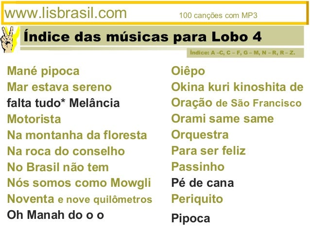 4. 4. Índice das músicas para Lobo 4www.lisbrasil.com 100 canções com MP3OiêpoOkina kuri kinoshita deOração de São FranciscoOrami same sameOrquestraPara ser felizPassinhoPé de canaPeriquitoPipocaMané pipocaMar estava serenofalta tudo* MelânciaMotoristaNa montanha da florestaNa roca do conselhoNo Brasil não temNós somos como MowgliNoventa e nove quilômetrosOh Manah do o oÍndice: A –C, C – F, G – M, N – R, R – Z.