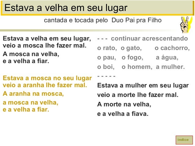 40. 40. Estava a velha em seu lugarEstava a velha em seu lugar,veio a mosca lhe fazer mal.A mosca na velha,e a velha a fiar.Estava a mosca no seu lugarveio a aranha lhe fazer mal.A aranha na mosca,a mosca na velha,e a velha a fiar.cantada e tocada pelo Duo Pai pra Filhoíndice- - - continuar acrescentandoo rato, o gato, o cachorro,o pau, o fogo, a água,o boi, o homem, a mulher.- - - - -Estava a mulher em seu lugarveio a morte lhe fazer mal.A morte na velha,e a velha a fiava.