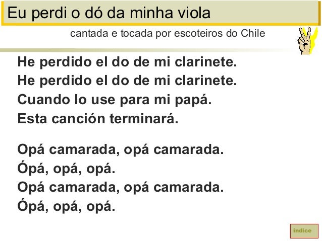 41. 41. Eu perdi o dó da minha violaHe perdido el do de mi clarinete.He perdido el do de mi clarinete.Cuando lo use para mi papá.Esta canción terminará.Opá camarada, opá camarada.Ópá, opá, opá.Opá camarada, opá camarada.Ópá, opá, opá.cantada e tocada por escoteiros do Chileíndice