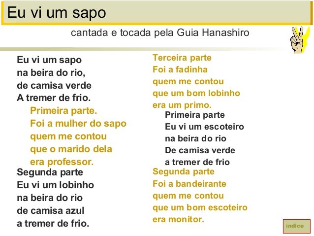 42. 42. Eu vi um sapoEu vi um sapona beira do rio,de camisa verdeA tremer de frio.Primeira parte.Foi a mulher do sapoquem me contouque o marido delaera professor.Segunda parteEu vi um lobinhona beira do riode camisa azula tremer de frio.cantada e tocada pela Guia HanashiroíndiceTerceira parteFoi a fadinhaquem me contouque um bom lobinhoera um primo.Primeira parteEu vi um escoteirona beira do rioDe camisa verdea tremer de frioSegunda parteFoi a bandeirantequem me contouque um bom escoteiroera monitor.